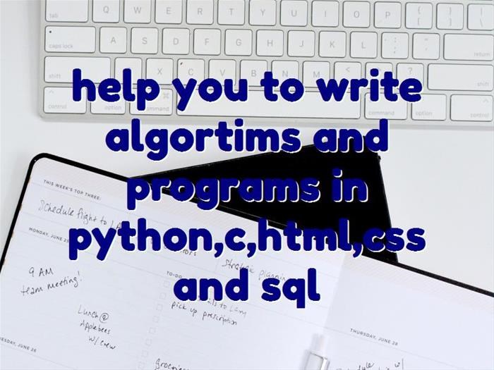 help you to write algortims and programs in python,c,html,css and sql